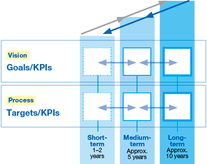 For the medium- (as of 2025) and short-term, we worked backwards from 2030 to plan the intermediate processes and measures needed to achieve these goals, which will be built into annual policies and business plans, and progress managed.