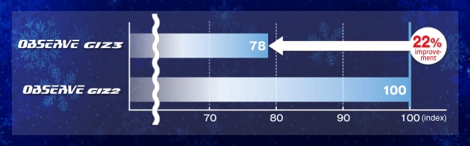The Toyo Tire Group has especially been focusing on improving tire performance on ice because that has a significant impact on automobile driving safety. In August 2024, we launched the OBSERVE GIZ3 studless tire for the Japanese market with improved and longer-lasting braking performance and start-up traction on icy roads. Tire adhesion on icy road surfaces has been improved by using T-MODE snow prediction technology to design new tire patterns, along with rubber compounds that stay soft even in low temperatures thanks to a blend of new materials such as sustainable high adhesion gel and sustainer grip polymer. This has helped achieve a 22% improvement in braking performance on icy roads over the previous model, the OBSERVE GIZ2.