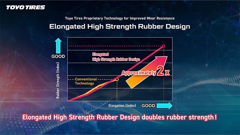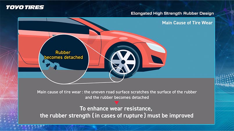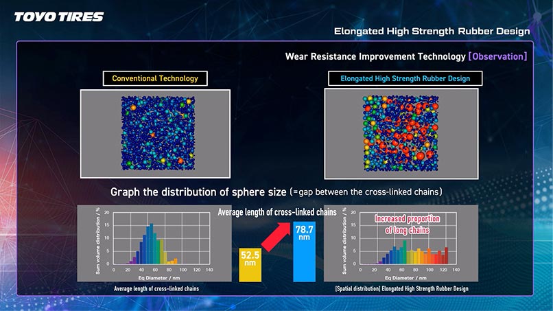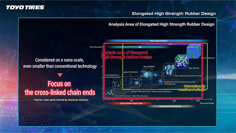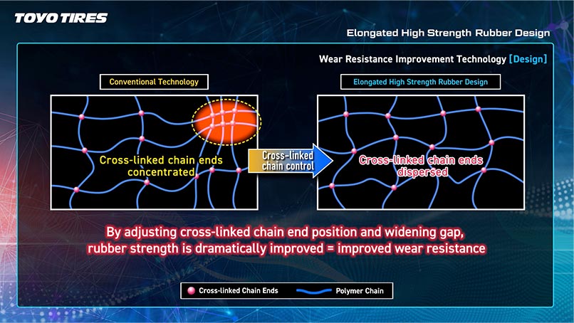 In the new technology, by controlling the cross-linked chains by dispersing the cross-linked chain ends and widening their gaps, rubber is designed to be resistant to break. This has dramatically improved rubber strength and improved tire’s wear resistance.