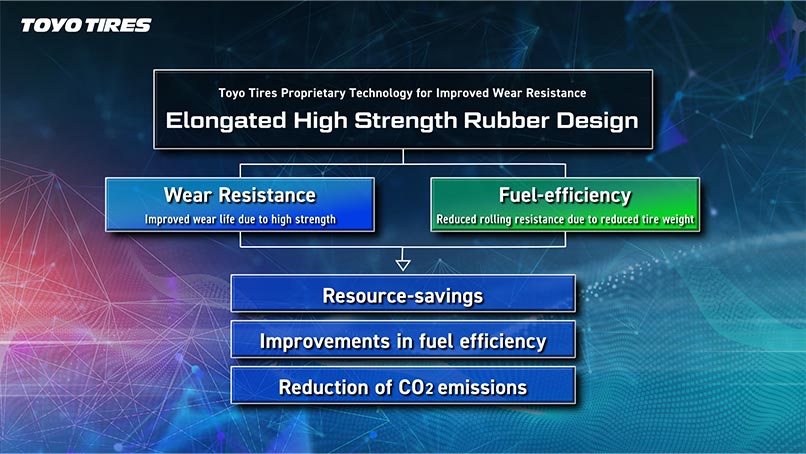 It is possible to save resources, improve fuel consumption efficiency, and reduce CO2 emissions through use of high-growth and high-strength rubber.